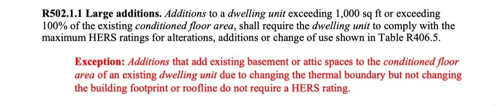 If you are finishing a basement or an attic, you don’t need to complete a full HERS rating of the home. Yet if you are turning a basement or attic into a permitted dwelling unit, those new ‘homes’ would need to meet the <42/45 HERS requirement, (except in a historic registered home, apparently) . This adds some clarity to a fringe scenario that causes some confusion when living space is added without change to the building thermal enclosure.