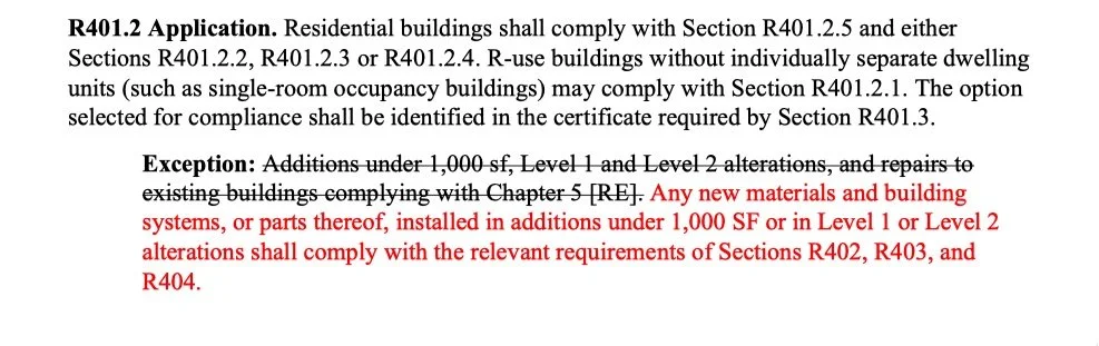 Red text in the excerpts below are the changes to the current 2021 IECC Stretch Code, that went into effect for all projects permitted after July 1, 2024.